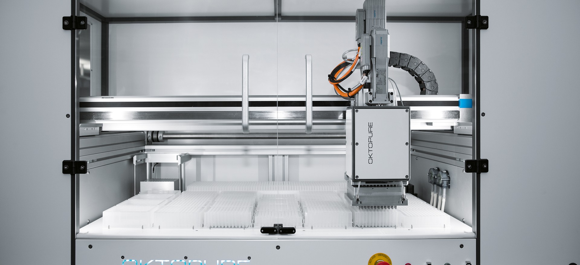 Durante o processo de extração, o robô precisa trabalhar com muita precisão. A ponta da pipeta deve ser posicionada para encher as placas com o líquido. Os controladores, motores e eixos elétricos da Festo garantem que a ponta da pipeta trabalhe, de forma rápida e precisa, ao milímetro. As soluções de automação laboratorial como essas serão cada vez mais utilizadas em laboratórios no futuro, para manter a competitividade no campo da melhoria vegetal.